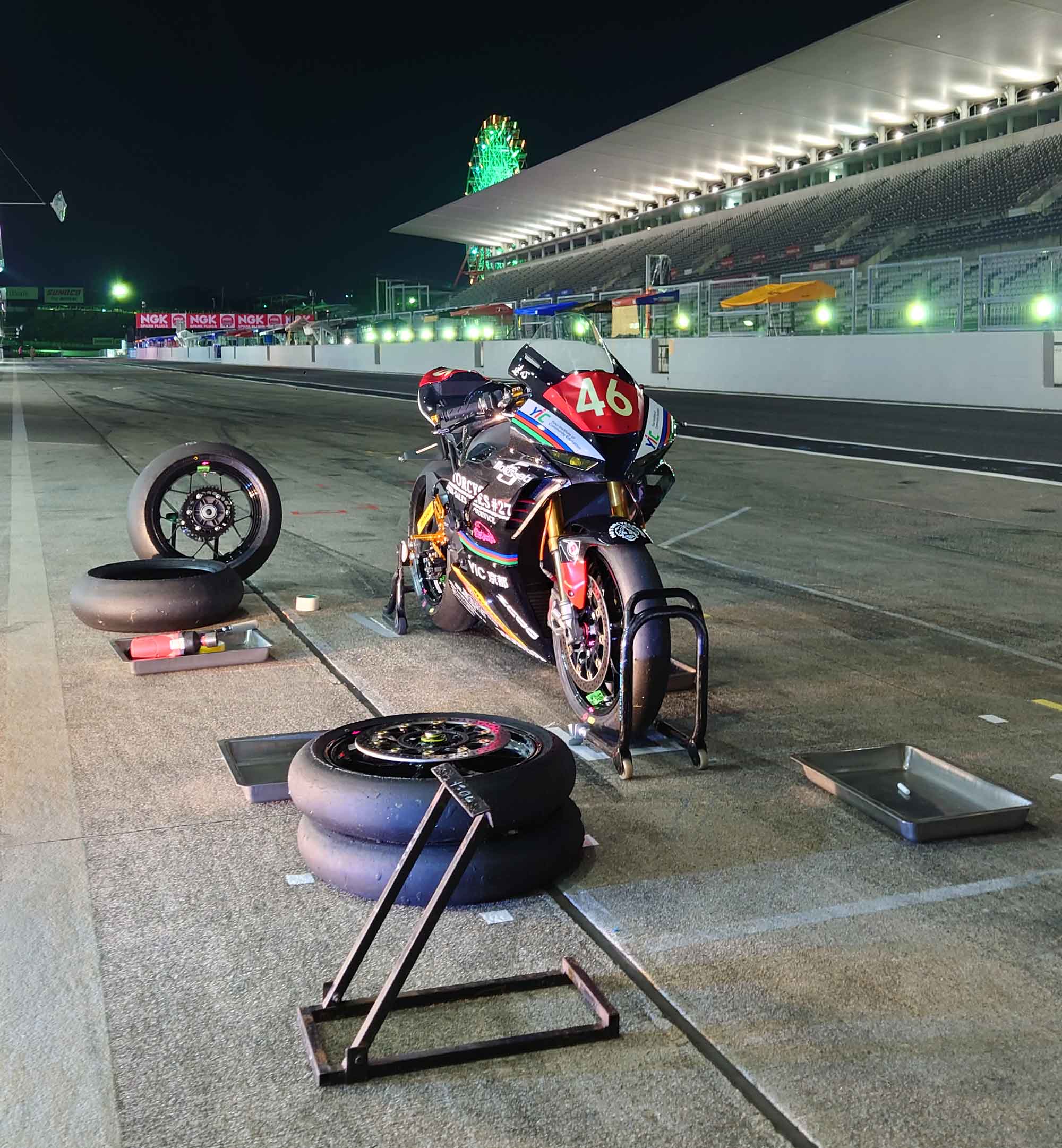 第3ライダーの江選手がフリープラクティスで転倒、怪我により欠場となり、西中選手と楠選手の2ライダーでの決勝となりました。猛暑の中の決勝ということでライダーの安全を第一に考え、各スティントの周回数を減らし全10スティントとしました。