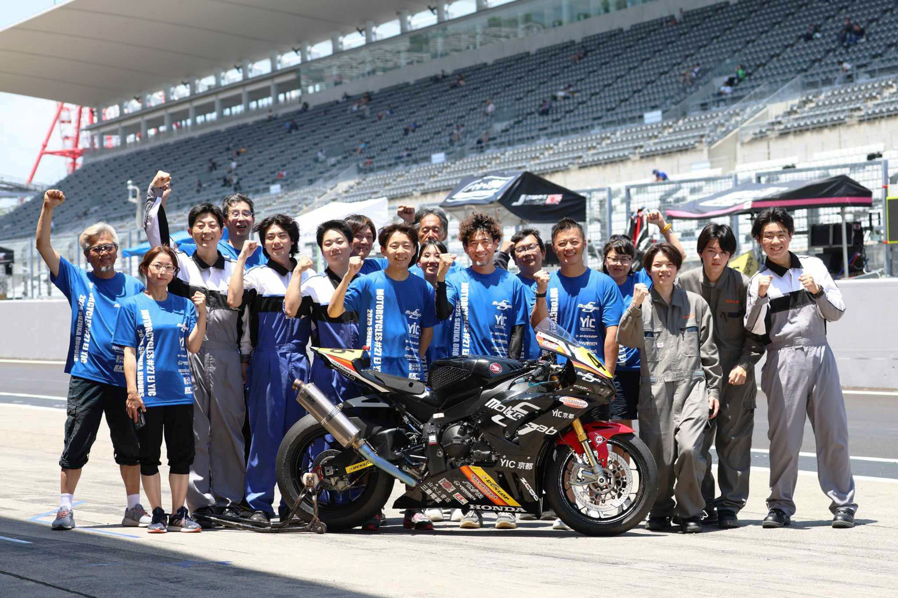 和歌山県のバイクショップ「MOTORCYCLES#27」と愛知県のバイクショップ「モトラボEJ」のコラボに、YIC京都工科自動車大学校の学生がメカニックとして参加する産学連携チームです。レース未経験の学生たちは給油とタイヤ交換を担当。現場での緊張感と責任を胸に、技術と情熱を注ぎます。ベテランライダーとルーキーライダーの熱闘と、学生たちの奮闘に最後まで応援よろしくお願い致します。